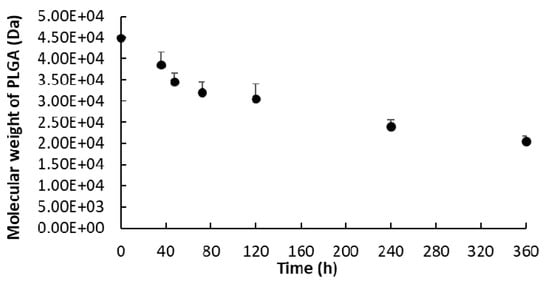 Change in molecular weight of PLGA of the degrading alginate-coated with chitosan nanoparticles loaded microcapsules as a function of incubation time (n = 3).