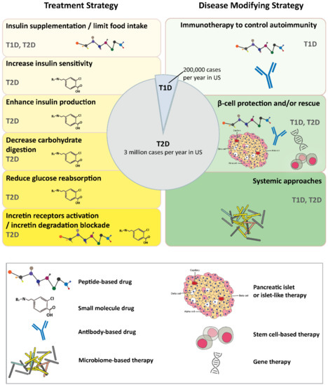 Thus far, all commercially available treatments provide remedies to compensate for the impaired insulin production or utilization. Next, we summarize the innovative approaches to cure diabetes. These therapeutics can be divided into immune therapy to control autoimmunity in T1D, cell therapy to rescues β-cell destruction, and systemic approaches that merge therapeutics and medical devices.