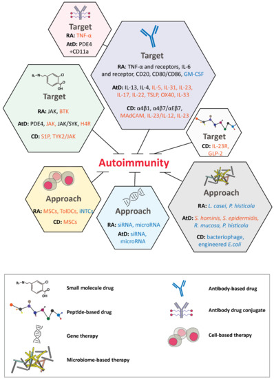 Figure 2. Therapeutic targets and modalities discussed here to inhibit autoimmunity in rheumatoid arthritis, atopic dermatitis, and Crohn’s disease. Targets shown in back represent corresponding drugs in the market. Targets and approaches in shown orange and blue represent corresponding drugs in clinical and clinical development, respectively. RA: Rheumatoid arthritis; AtD: Atopic dermatitis; CD: Crohn’s disease; TNF: Tumor necrosis factor; PDE4: Phosphodiesterase 4; JAK: Janus kinase; BTK: Bruton’s tyrosine kinase; SYK: Spleen tyrosine kinase; H4R: Histamine H4 receptor; S1P: Sphingosine 1-phosphate; TYK2: Tyrosine kinase 2; GM-CSF: Granulocyte-macrophage colony stimulating factor; TSLP: Thymic stromal lymphopoietin; MAdCAM: Mucosal addressin cell adhesion molecule; GLP-2: Glucagon-like peptide 2; MSCs: Mesenchymal stem cells; TolDCs: Tolerogenic dendritic cells; INTCs: Invariant natural killer T cells; siRNA: Short interfering RNA.