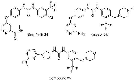 | Sorafenib 24 [93] | - | - | - | - | 74 | drug approved for Renal Cell Carcinoma, Hepatocellular Carcinoma, AML, and Advanced Thyroid Carcinoma |