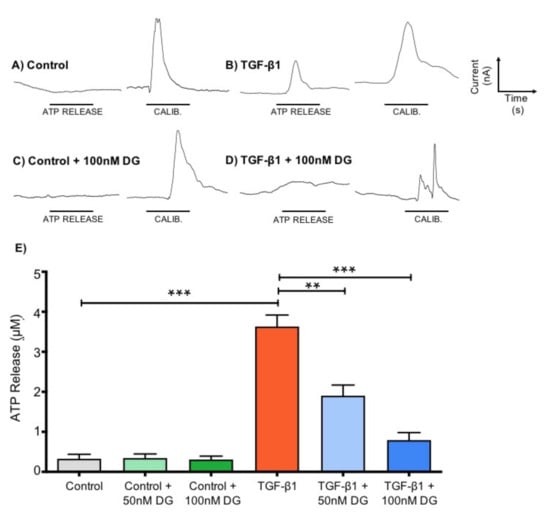 Danegaptide prevents TGFβ1-evoked increases in ATP release. HK2 cells were cultured in low glucose (5 mM) with/without TGFβ1 (10 ng/mL) ± danegaptide (50 or 100 nM) for 48 h. Representative biosensor traces show ATP release following removal of extracellular calcium. Control cells (panel (A)) exhibit negligible ATP release compared to a calibration (CALIB) response to 10 μM ATP, whilst a marked increase in release was observed from TGFβ1-treated cells (panel (B)). Danegaptide (100 nM) alone failed to alter basal ATP (panel (C)) but significantly reduced TGFβ1-evoked ATP release (panel (D)). Peak responses were quantified by comparing against a known concentration of ATP (10 µM) and mean data ± SEM plotted (panel (E)). Results are representative of 3 separate experiments (n = 3; ** p < 0.01, *** p < 0.001; one-way ANOVA and Tukey’s post-test).