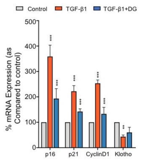 To determine whether danegaptide can negate hemichannel-mediated regulation of common cell cycle and reno-protective markers, hPTECs were incubated with TGFβ1 (10 ng/mL) ± danegaptide (100 nM) for 12 h and the expression of candidate gene mRNA assessed through qPCR analysis. Addition of danegaptide to TGFβ1-treated hPTECs returned the expression of p16 from 358.8 ± 21.1% to 193 ± 18.5% of controls, p21 expression from 221.8 ± 12.9% to 142.2 ± 6.2% and cyclin D1 expression from 253.2 ± 7.7% to 132.9 ± 15.0% (Figure 3; p ≤ 0.001, n = 3). In addition, danegaptide partially reversed the decline in Klotho from 43.3 ± 3.8% to 59.9 ± 11.7% of controls (Figure 3, n = 3).