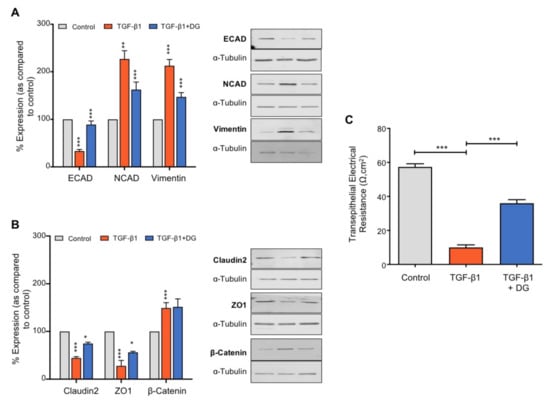 Danegaptide reduces TGFβ1-evoked changes in adherens and tight junction proteins and epithelial leakiness. Primary hPTECs were cultured in low glucose (5 mM) ± TGFβ1 (10 ng/mL) ± danegaptide (100 nM) for 48 h. Expression of E-cadherin (ECAD), N-cadherin (NCAD) and vimentin (panel (A)) and of claudin-2, zona occludens 1 (ZO-1) and β-catenin (panel (B)) was assessed via Western blotting. TGFβ1 reduced E-cadherin, claudin-2 and ZO-1 expression and increased N-cadherin and vimentin expression. Effects were partially reversed by danegaptide (100 nM). Representative blots for each protein are shown, with expression normalised by re-probing for ɑ-tubulin as a loading control. Results are presented as the mean ± SEM (n = 3), with key significances indicated (* p < 0.05, ** p < 0.01, *** p < 0.001; one-way ANOVA and Tukey’s post-test). In panel (C), transepithelial electrical resistance (TER) assessed the consequence of altered adherens and tight junction protein expression on epithelial integrity. HK2 cells were cultured in low glucose (5 mM) on Transwell inserts and transepithelial resistance measured. TGFβ1 reduced TER, an effect partially restored by the addition of danegaptide (100 nM). Data are expressed as the mean ± SEM (n = 3; *** p < 0.001).