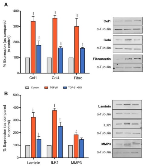 Caused by an imbalance between formation and degradation, the accumulation of the ECM is a major hallmark of CKD. A role for TGFβ1 in this process is well established [], and understanding how to negate these changes has clear implications to progression of the disease. To examine the effect of danegaptide on TGFβ1-evoked changes in the expression of ECM proteins, hPTECs were cultured in low glucose (5 mM) for 48 h, serum-starved overnight and treated with TGFβ1 (10 ng/mL) ± danegaptide (100 nM) for 48 h. Compared to controls, TGFβ1 increased the expression of the ECM proteins collagen I (334.6 ± 30.14%), collagen IV (354.5 ± 16.9%), fibronectin (301.7 ± 50.4%) and laminin (324.8 ± 36.4%) (Figure 5A,B; p ≤ 0.001, n = 3). Co-incubation with danegaptide significantly attenuated these changes, restoring the expression to 180.7 ± 27.3% (collagen I), 164 ± 6.9% (collagen IV), 161.3 ± 4% (fibronectin) and 149 ± 20.4% (laminin) (p ≤ 0.001; n = 3 in each case). Danegaptide (100 nM) also reduced TGFβ1 (10 ng/mL)-evoked changes in integrin-linked kinase 1 (ILK1) from 378.9 ± 16.8% to 251.8 ± 33% (p ≤ 0.001) but had minimal effect on matrix metalloproteinase 3 (MMP3), reducing the expression from 185.3 ± 19.6% with the cytokine alone to 147.1 ± 12.2% when co-incubated with danegaptide (Figure 5B).