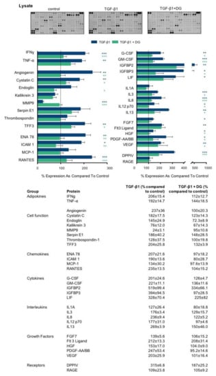 The inflammatory response in and around proximal tubules involves both the activation of multiple cell types and the secretion of numerous inflammatory markers. Specifically, soluble chemokines, cytokines and growth factors recruit and activate infiltrating immune cells and stimulate resident fibroblasts. Sustained activation of these cells mediates tubulointerstitial fibrosis. We used the proteome profiler array to determine whether danegaptide negates TGFβ1-induced changes in the expression and secretion of key proinflammatory mediators. Primary hPTECs were cultured, as described above, and treated with TGFβ1 (10 ng/mL) ± danegaptide (100 nM) for 48 h. A list of changes in lysate (Figure 6) and supernatant (Figure 7) are provided for 31 candidate proteins grouped by primary function.