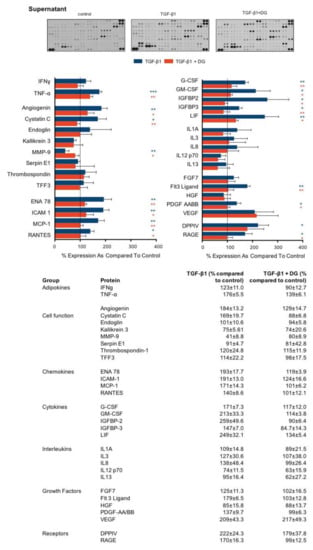 2.7. Danegaptide Reduces TGFβ1-Evoked Changes in the Expression of Adipokines, Chemokines, Growth Factors and Interleukins from hPTECs
