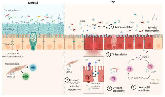 Schematic representation of matrix metalloproteases (MMPs) mechanisms of action in healthy contet (Normal) and in inflammatory bowel disease (IBD) pathophysiogenesis. The release of soluble TNF-α resulting from the shedding of membrane-bound TNF by MMPs causes mucus depletion (1) and tight-junction destabilization (2), leading to increased epithelial permeability and bacterial translocation. The abrogation of myofibroblast ability in suppressing Th1/Th17 occurs after the MMP processing of membrane-bound PD-L1 to produce soluble PD-L1 (3). Cytokine processing contributes to inflammation processes (4). PGP generation through collagen degradation by MMPs induces neutrophil transmigration and stimulates neutrophil MMP and CXCL8 secretion, therefore sustaining the inflammatory context (5). CXCL8: (C-X-C motif) ligand 8, MLCK: myosin light-chain kinase, PD-L1: programmed death-ligand 1, mPD-L1: membrane-bound PD-L1, sPD-L1: soluble PD-L1, (N-Ac)-PGP: (N-acetyl)-proline-glycine-proline, TJ: tight junction, TNF: tumor necrosis factor α.