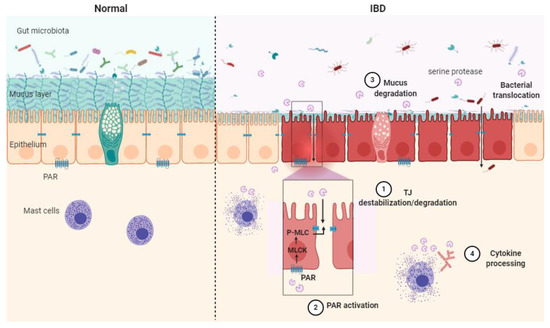Schematic illustration of the serine protease mode of action in healthy context (Normal) and in inflammatory bowel disease (IBD) pathology. Epithelial barrier impairment is associated with serine protease action on the tight junction through direct cleavage. (1) Indirect destabilization deriving from protease-activated receptor (PAR) activation (2), mucus degradation (3) and cytokine processing (4). MLC: myosin light-chain, P-MLC: phosphorylated MLC, MLCK: myosin light-chain kinase, PAR: protease-activated receptor, TJ: tight junction.