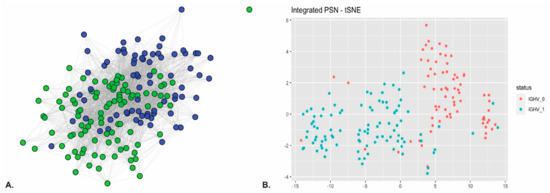 On the other hand, netDx [107,164] is a recently published Bioconductor R package, which provides a novel methodology of implementing patient similarity networks for efficient patient classification, which has been shown to outperform other machine learning approaches. It can integrate heterogeneous patient data from clinical to omics layers, while implementing machine learning algorithms for robust feature selection. Furthermore, it uses Cytoscape (RCy3) for the efficient visualization and interpretability of the inferred biological networks. Finally, as the two aforementioned methodologies can’t be directly compared, we selected two different multi-omics cancer datasets, for the different computational approaches. In particular, the TCGA-LUAD dataset was selected for the unsupervised approach, based on the absence of known molecular subtypes between the patients. For the hypothesis driven netDx approach, we selected the CLL dataset, as the IGHV mutational status is a known clinical marker that separates patients into distinct classes (see Materials and Methods Section 4.2 and Section 4.3).