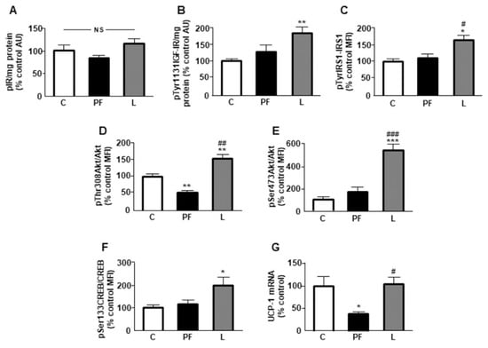 - Valverde, A.M.; Arribas, M.; Mur, C.; Navarro, P.; Pons, S.; Cassard-Doulcier, A.M.; Kahn, C.R.; Benito, M. Insulin-induced up-regulated uncoupling protein-1 expression is mediated by insulin receptor substrate 1 through the phosphatidylinositol 3-kinase/Akt signaling pathway in fetal brown adipocytes. J. Biol. Chem. 2003, 278, 10221–10231. [Google Scholar] [CrossRef]