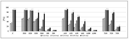 The dynamics of barley grain germination represented by calculated Percentage of Germination (%) on 1st, 2nd, 3rd, 4th and 5th day of cultivation. Variants: C—control/untreated barley grains; O10–O300: barley grains treated with plasma generated in an oxygen atmosphere for 10, 20, 30, 60, 180 or 300 s; A10–A300: barley grains treated with plasma generated in ambient air for 10, 20, 30, 60, 180 or 300 s; N10–N300 barley grains treated with plasma generated in a nitrogen atmosphere for 10, 20, 30, 60, 180 or 300 s. Bars are means of ten experimental runs (one run represents 50 grains per variant, n = 500) ± SD.
