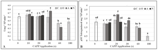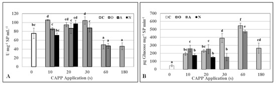 Activities of protease (A) and glucanase (B) in 3-day old barley seedlings after CAPP treatment. Variants: C—control/untreated barley grains; O10–O300: barley grains treated with plasma generated in oxygen atmosphere for 10, 20, 30, 60, 180 or 300 s; A10–A300: barley grains treated with plasma generated in ambient air for 10, 20, 30, 60, 180 or 300 s; N10–N300 barley grains treated with plasma generated in nitrogen atmosphere for 10, 20, 30, 60, 180 or 300 s. Different letters indicate significant difference at p-value < 0.05, bars are means of ten experimental runs (one run represents 50 seeds per variant; three 1.5-g mixed samples were analyzed per experimental run and each variant for protease and glucanase activities) ± SD according to Tukey’s HSD test.