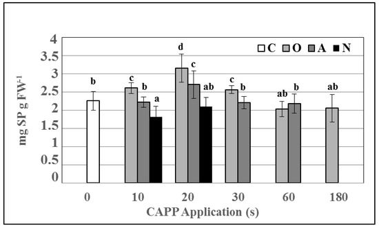 Total soluble protein concentration in 3-day-old barley seedlings after CAPP treatment. Variants: C—control/untreated barley grains; O10–O300: barley grains treated with plasma generated in an oxygen atmosphere for 10, 20, 30, 60, 180 or 300 s; A10–A300: barley grains treated with plasma generated in ambient air for 10, 20, 30, 60, 180 or 300 s; N10–N300 barley grains treated with plasma generated in a nitrogen atmosphere for 10, 20, 30, 60, 180 or 300 s. Different letters indicate significant difference at p-value < 0.05, bars are means of ten experimental runs (one run represents 50 seeds per variant; three 1.5-g mixed samples were analyzed per experimental run and each variant for soluble protein concentration) ± SD according to Tukey’s HSD test.