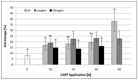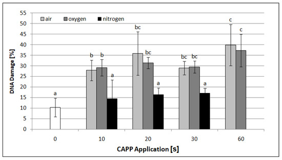 Graphical representation of the CAPP generated in ambient air, oxygen and nitrogen at exposure times of 10–60 s on the degree of double-strand breaks in barley leaves’ DNA, analyzed by constant field gel electrophoresis (CFGE). The data were analyzed using the statistical method LSD ANOVA and comparisons between the mean values were considered significant at p ≤ 0.05. Bars are means of three experimental runs ± SD.