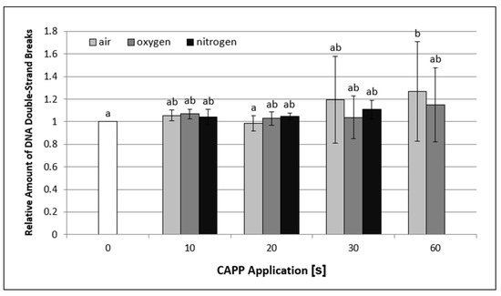 As by comet assay, it is possible to detect both, single- and double-strand breaks, the CFGE method was used for double-strand break evaluation specifically. As shown in Figure 8, the relative amount of DNA double-strand breaks increased only at longer exposure times. The highest and only statistically significant increase compared to control samples was observed in 60-s exposure to plasma generated in ambient air (1.27-fold). These results suggest that CAPP treatment does not induce DNA double-strand break formation and that DNA damage observed by standard comet assay was mainly represented by single-strand breaks.