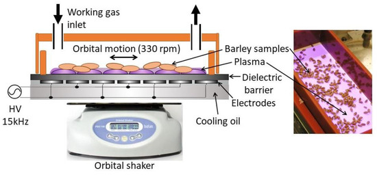 The experimental apparatus is shown in Figure 9. The DCSBD was placed on an orbital shaker and the homogeneity of samples’ treatment was ensured by the movement of samples at 330 rpm. The DCSBD was powered by a sinusoidal voltage of 20 kV (peak to peak) and a frequency of 15 kHz. The input power supplied to the DCSBD was 400 W and up to 50 barley seeds were placed in the DCSBD discharge area. The treatment was realized in a closed chamber in laboratory air and in oxygen or nitrogen in a flow regime with a flow rate of 3 Lpm and was the same for each working gas. Exposure times were 10, 20, 30, 60, 180 and 300 s for each working gas.