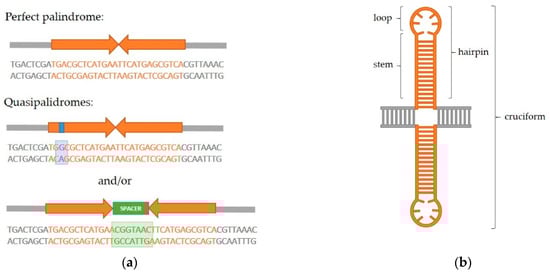 A palindrome in DNA is a sequence consisting of two identical or highly similar inverted repeats which are either adjacent to one another or separated by a spacer region (Figure 1a). If the repeats (also called the palindrome arms) are identical and have no spacer in between, the palindrome is referred to as perfect. The term quasipalindrome can be used to refer to a non-perfect palindrome. Palindromes are found in genomes of all species investigated so far and they often play important roles as binding sites for homodimeric proteins, parts of promoters, replication origins or other regulatory sequences []. However, many of the discovered palindromes have no known biological function and can be relatively long (from several dozen to several hundred base pairs). If a palindrome is of sufficient length, intrastrand base pairing can occur and this results in formation of secondary structures in DNA (Figure 1b). In the single-stranded DNA, a hairpin structure forms, while in the double-stranded DNA, a cruciform structure consisting of two hairpins, one in each strand, forms. Each hairpin consists of a stem comprised of complementary paired inverted repeats and a loop. The loop either consists of bases within the spacer, if such region is present in a specific palindrome, or of four–six bases which lie in the center of symmetry of the two inverted repeats and cannot be complementarily paired due to the rigidity of the DNA strand [,]. It is considered that a hairpin structure can occur in the single-stranded lagging strand during DNA replication. A cruciform structure forms in dsDNA by gradual extrusion which begins at the center of the palindrome. After denaturation of a short region of DNA at the center, intrastrand base pairing occurs and a small proto-cruciform forms which can further extrude into a larger cruciform [,,]. Conditions which lead to cruciform extrusion have been extensively studied in vitro [,,,] and theoretical kinetic models of cruciform extrusion were postulated [,]. These experiments show that cruciform extrusion is thermodynamically unfavorable, and in those early studies, it was debated if extrusion is even possible in vivo. However, processes such as transcription and replication can increase the density of negative supercoils in DNA. The added torsion can be released through cruciform extrusion and this is considered to be a mechanism driving extrusion in vivo [,,].