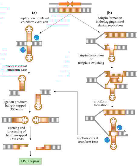 Molecular mechanisms of palindrome recombinogenicity have been investigated in model organisms Escherichia coli and Saccharomyces cerevisiae as well as in human cells. While in E. coli the recombinogenicity of palindromes seems to be exclusively replication-related [,,], in eukaryotic cells, both hairpin formation during replication and cruciform formation not related to replication seem to be at play [,,]. The mechanisms of DSB formation and processing of palindromic sequences in eukaryotic cells are shown in Figure 2 and explained in detail in Section 2.2.1 and Section 2.2.2.