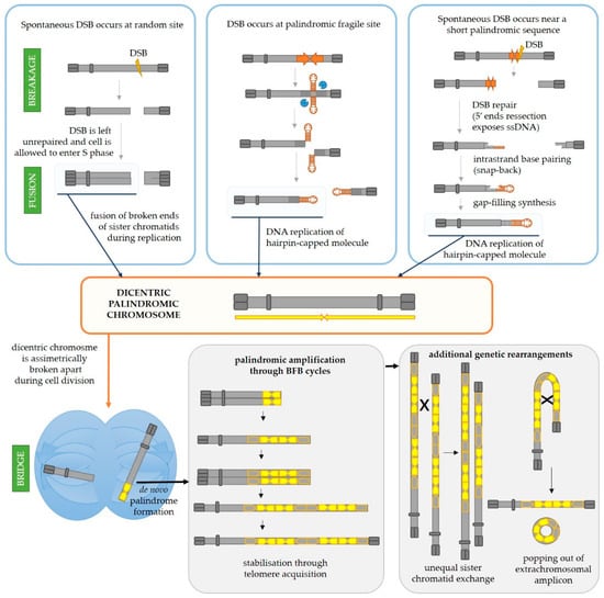 Mechanisms responsible for initiation of de novo palindrome formation followed by subsequent palindromic amplifications and additional genetic rearrangements typical for cancer cells. On the left upper panel, the initial steps of the breakage-fusion-bridge (BFB) mechanism are shown. If a DSB is left unrepaired and the DNA is subsequently replicated, the broken ends of sister chromatids can fuse to form two palindromic chromosomes, one of which will be dicentric. Middle and right upper panels depict alternative mechanisms for formation of a palindromic dicentric chromosome, an initiating event for palindromic amplification. In the middle panel, a DSB is mediated by a secondary structure-forming palindrome in the genome. As explained in detail in Section 2, this results in hairpin-capped DSB ends. If left unprocessed, the replication of the centromere-proximal hairpin-capped molecule results in an dicentric chromosome. On the upper right panel, the fold-back priming mechanism is depicted. If a DSB occurs in the vicinity of a palindrome or short inverted repeats, the DSB repair, which normally involves 5′ end resection, will expose the repeats in the ssDNA form. This can allow for intrastrand base pairing (fold-back) and the folded 3′-end can then serve as a primer for gap-filling DNA synthesis. The resulting hairpin-capped molecule can also lead to occurrence of a dicentric chromosome upon DNA replication. Regardless of the initial mechanism of formation, the palindromic dicentric chromosome can be asymmetrically broken during cell division and one of the resulting chromosomes will carry a de novo formed palindrome (palindromic duplication). Additional BFB cycles can result in palindromic amplifications of certain genomic regions and such chromosome could at some point become stabilized by telomere addition, thus breaking iterations of BFB cycles (lower middle panel). However, additional genetic rearrangements and gene copy number gains or losses can arise through unequal sister chromatid exchange and intrachromosomal recombination between the acquired repeats which can result in the popping out of an extrachromosomal amplicon (double minute chromosome), also a typical feature of cancer cells.
