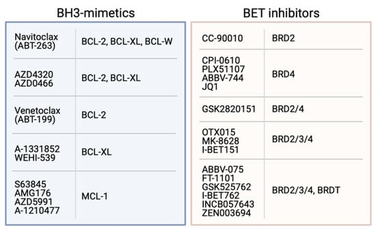 - Fiskus, W.; Cai, T.; DiNardo, C.D.; Kornblau, S.M.; Borthakur, G.; Kadia, T.M.; Pemmaraju, N.; Bose, P.; Masarova, L.; Rajapakshe, K.; et al. Superior efficacy of cotreatment with BET protein inhibitor and BCL2 or MCL1 inhibitor against AML blast progenitor cells. Blood Cancer J. 2019, 9, 4. [Google Scholar] [CrossRef]