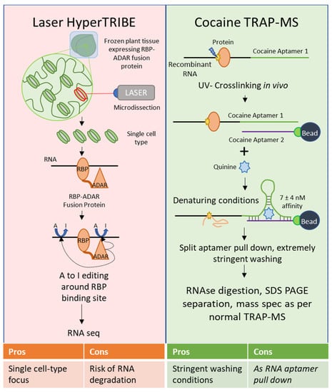 Proposed Modifications to Existing Techniques for Future Advancement. Laser HyperTRIBE—This is not a true modification to the HyperTRIBE approach itself, but rather a pairing of that approach with laser microdissection to enable the strengths of HyperTRIBE (capacity to accommodate small amounts of starting material) to be applied to plants. In this approach, intact plant tissue would be fixed prior to flash freezing, and then the cell types of interest selected via laser microdissection used for HyperTRIBE. Cocaine TRAP-MS—This modification suggests that rather than RNA aptamers that rely on protein binding capabilities, nucleotide-nucleotide aptamers should be prioritized. The split cocaine aptamer consists of two RNA fragments that interact at very high affinity in the presence of cocaine, or preferably quinine thanks to its increased affinity and ease of access. The high affinity of this interaction would permit extremely stringent washing conditions, which are critical in minimizing false positives.