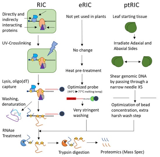 These studies provide us with a perspective on heterogenous plant samples grown under normal conditions and provide a baseline against which future studies may compare the results of experiments using the array of sample types described. Since their publication, the RIC method has been applied to Arabidopsis cell cultures grown under drought stress (using PEG to simulate drought conditions in culture) to identify 150 RBPs responsive to drought stress []. Similarly, RIC was used to probe modifications of the spliceosome and its RBPs in response to drought, identifying 44 spliceosomal proteins and 32 proteins associated with stress granules []. Like the previous studies, this work identified many metabolic enzymes interacting with RNA, comprising proteins involved in carbohydrate metabolism and the glycolytic and citric acid pathways. Recently, several optimizations of the RIC protocol—deemed enhanced RNA interactome capture or eRIC—were described, but these modifications have yet to be applied to plants [] (Figure 3). Separately, RIC has been optimized for leaf tissue (termed plant RNA interactome capture or ptRIC) by adjusting UV conditions, irradiating both adaxial and abaxial surfaces of leaves, increasing the stringency of washing conditions, and shearing genomic DNA by passing the RNA-loaded beads through a narrow needle [] (Figure 3). It remains now for RIC or its derivatives to be used to view the changes of the RBPome in response to biotic and abiotic stresses beyond drought.
