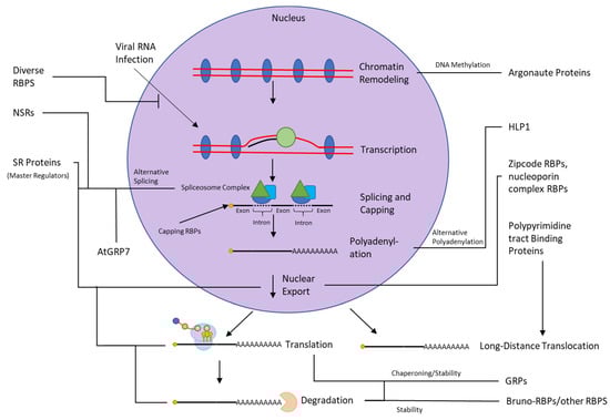 Fully transcribed and spliced mRNAs are polyadenylated at the end of the 3’ UTR (although alternative polyadenylation sites with significance in transcript stability, expression, and regulation have been observed), by the polyadenylation complex which is composed of a large number of proteins, some of which are RBPs [,]. Finally, the ribosome itself is a ribonucleoprotein complex containing at least 80 ribosomal proteins, many of which are RBPs [].