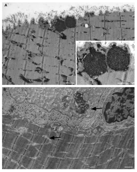 Electron microscopy of muscle fibers in longitudinal section of a patient with Pompe disease. (A) Pre-treatment muscle fiber. Two glycogen-filled lysosomes under sarcolemma are enlarged in the inset. Massive glycogen accumulations are also present within intermyofibrillar spaces. (B) Post treatment muscle fiber shows relevant glycogen reduction. A low amount of glycogen granules (arrows) still appears located within some intermyofibrillar spaces. Scale bar = 1 µm. Inset scale bar = 0.5 µm.