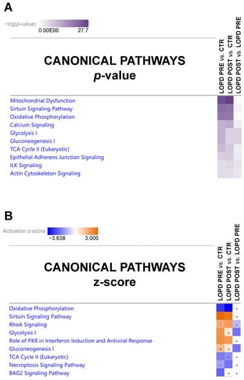 Canonical pathway heatmap displaying the most significant results (p-value in panel (A) and z-scores in panel (B)) across datasets in LOPD PRE vs. CTR, LOPD POST vs. CTR. and LOPD POST vs. LOPD PRE. The orange and blue colored rectangles indicate predicted pathway activation or predicted inhibition, respectively, via the z-score statistic (z-score ≥ 2, ≤ −2). Dots are non-significant values for z-score.