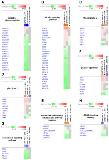 The canonical pathway heatmap shown in Figure 3 displays the most significant results across datasets in LOPD PRE vs. CTR, in LOPD POST vs. CTR, and in LOPD POST vs. LOPD PRE. Results according to p-value are shown in panel A, and results according to z-scores are shown in panel B and in Table S4. The orange and blue colors indicate, respectively, the predicted pathway activation or inhibition via the z-score statistic (z-score ≥ 2, ≤ −2). As shown in Figure 3B, the main pathways inhibited in LOPD PRE compared to CTR were oxidative phosphorylation and BAG2 signaling pathway, whereas sirtuin signaling, glycolysis, and PKR role in interferon induction and antiviral response were activated. In LOPD POST vs. CTR, oxidative phosphorylation and, to a lesser extent, necroptosis signaling pathway were inhibited, whereas sirtuin signaling, RhoA signaling, and role of PKR in interferon induction and antiviral response were activated. Moreover, in LOPD POST vs. LOPD PRE glycolysis and gluconeogenesis were inhibited.