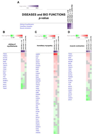 (A) Diseases and bio functions heatmap displaying the most significant results (p-value, Table S5) across datasets in LOPD PRE vs. CTR, LOPD POST vs. CTR, and LOPD POST vs. LOPD PRE. (B,C,D) Gene heatmap enables to visualize protein expression data in a specific disease and biofunction, across multiple analyses at one time. Green and red colors refer to decrease or increase for each individual protein statistically changed in our proteomics dataset. Grey color indicates changes statistically non-significant for p-value (ANOVA followed by Tukey’s post-hoc test (p < 0.05)). Dots are non-significant values for z-score (z-score ≥ 2, ≤ −2).
