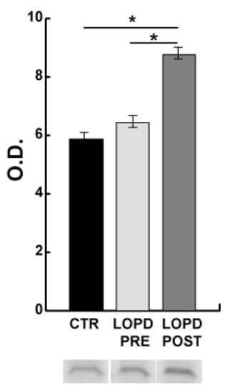 Dysregulation of proteins involved in the unfolded protein response (UPR) and increased levels of transitional endoplasmic reticulum ATPase (VCP) necessary for export of misfolded proteins from ER to the cytoplasm, and of HSPA5, suggest activation of the ER stress response. To corroborate these findings, UPR response was confirmed by immunoblotting of C/EBP-homologous protein (CHOP). Results showed increased levels of CHOP, particularly in LOPD POST compared to controls, indicating that the transcription factor is active and promotes UPR (Figure 6).