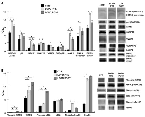 To correlate proteomic and IPA results with molecules involved in macroautophagy and apoptosis, several proteins were quantified by immunoblotting on muscle extracts in LOPD PRE and LOPD POST vs. controls. Specifically, Figure 7 shows the semi-quantitative results of microtubule associated protein 1 light chain 3 beta (LC3B), ubiquitin-binding protein p62 (p62), sintaxin 17 (STX17), synaptosomal-associated protein 29 kDa (SNAP29), endobrevin (VAMP8), Golgi reassembly-stacking protein 2 (GORASP2), lysosome-associated membrane protein 2 (LAMP2), BCL2/adenovirus E1B 19 kDa protein-interacting protein 3 (BNIP3). Figure 7b shows results of protein kinase AMP-activated catalytic subunit alpha 1 (AMPK), p38 mitogen-activated protein kinases 11 (p38β), and fork head box O3 (FoxO3). Results indicate that LC3BII/LC3BI, STX17, and LAMP2 followed the same behavior, all being increased in LOPD PRE and such increase was retained in LOPD POST compared to controls; while p62 and SNAP29 were increased in LOPD PRE compared to controls. VAMP8 and GORASP2 were at variance: VAMP8 decreased in LOPD POST whereas GORASP2 increased in LOPD POST compared to controls. Notably, regarding BNIP3, both monomer and dimer were increased in LOPD PRE compared to the controls, confirming dysregulation of the sirtuin pathway and its possible association to apoptosis under p38β-FOXO-BNIP3 axis. Increase of phospho-AMPK and phospho-p38β was observed in both LOPD PRE and LOPD POST compared to controls. AMPK increased both in LOPD PRE and POST compared to controls, whereas p38β was unchanged. Phospho-FoxO3 increased in LOPD PRE compared to POST and also compared to the controls. Meanwhile, FoxO3 was more abundant both in LOPD PRE and LOPD POST, compared to controls.