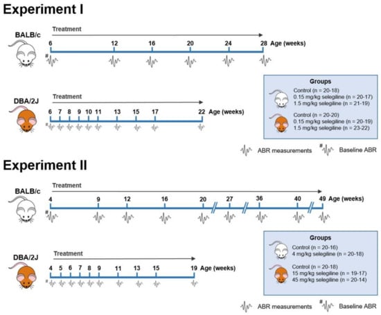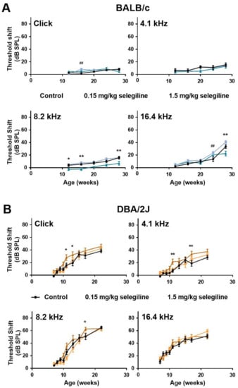 Szepesy, J.; Humli, V.; Farkas, J.; Miklya, I.; Tímár, J.; Tábi, T.; Gáborján, A.; Polony, G.; Szirmai, Á.; Tamás, L.; et al. Chronic Oral Selegiline Treatment Mitigates Age-Related Hearing Loss in BALB/c Mice. Int. J. Mol. Sci. 2021, 22, 2853. https://doi.org/10.3390/ijms22062853