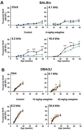 2.1. Effect of Chronic Oral Administration of Selegiline on Hearing Function in BALB/c and DBA/2J Mice