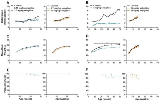 2.2. Effect of Chronic Oral Selegiline Administration on Water Intake, Body Weight and Survival Rate of BALB/c and DBA/2J Mice