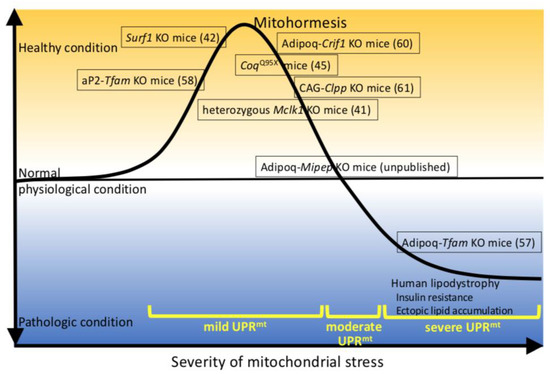 Recently, it was reported that the inhibition of mitochondrial translation led to the coordinated suppression of cytosolic translation, which might be targeted to promote lifespan [68]. Therefore, we should examine the mito-cytosolic translational balance to understand the pathologies involved in UPRmt. From the viewpoint of glucose tolerance and UPRmt based on the findings described in this review, we would like to propose “mitohormesis” in lipoatrophic models (Figure 1). The various severities of mitochondrial stress resulting from defective proteins involved in mitochondrial function induce varying degrees of UPRmt. In cases of mild mitochondrial stress such as that in Adipoq-Crif1 KO mice [60], in Cag-Clpp KO mice [61], and in aP2-Tfam KO mice [58], UPRmt, including chaperones, proteases, and mitokines, might be fully induced, probably improving whole-body metabolism including glucose tolerance. Such mild UPRmt might extend the lifespan. To the best of our knowledge, UPRmt has not been evaluated in Clk1 KO mice, which have high mitochondrial oxidative stress, low non-mitochondrial oxidative damage, and a long lifespan; however, it was reported that mild UPRmt was induced in Surf1 KO mice, which also have a long lifespan [41,42]. Therefore, the mitochondrial oxidative stress might also induce UPRmt. GDF15 and FGF21 are representative mitokines induced by UPRmt. As mentioned above, Fgf21 Tg and Gdf15 Tg mice have extended lifespans [51,52]. In the case of our Adipoq-Mipep KO mice, the expressions of mitokines were induced, but those of mitochondrial chaperones and proteases were not. Therefore, it is likely that UPRmt is not fully induced in these mice or that UPRmt-induced beneficial actions are canceled by deteriorated mitochondrial functions. Unfortunately, UPRmt has not been investigated in cases of severe mitochondrial stress such as that in Adipoq-Tfam KO or Adipoq-Pparγ KO mice. However, UPRmt might be not induced, or severe mitochondrial stress might surpass the beneficial actions of UPRmt, leading to accelerated glucose intolerance, ectopic lipid accumulation, and inflammation (Figure 1).