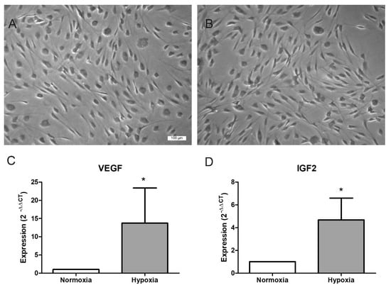 Characterization of adipose-derived mesenchymal stromal/stem cells (ASCs) in normoxia and hypoxia. (A,B) Cell morphology after culture in a normoxic (A) or a hypoxic environment (1% O2) (B) after 48 h (phase contrast microscopy, scale bar = 100 µm). (C,D) Effect of hypoxia on mRNA expression of vascular endothelial growth factor (VEGF) and insulin-like growth factor 2 (IGF2). Expression was quantified by qPCR analysis, normalized to β-actin, and calculated relative to the control using the ΔΔCT method (mean ± SD; n = 5, * p < 0.05).