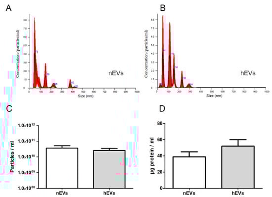 The average protein concentration in isolated hEVs was higher than that in nEVs. The average protein concentration of the EV isolations was 38.9 ± 6.1 µg/mL (nEVs) and 52.0 ± 8.0 µg/mL (hEVs), respectively (normalized to mL conditioned medium used for EV isolation) (Figure 2D). The average absolute protein concentration in the EV isolations was 260 µg for nEVs and 317 µg for hEVs (in 400 µL EV solution after SEC and final concentration of the solution). No significant differences were detected in the particle size and protein content analyses.