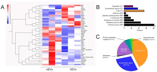 Analysis of proteomics. Six selected protein samples from EV isolations (3 nEVs versus 3 hEVs samples) were used to perform proteomic analysis via mass spectrometry. (A) Heatmap with hierarchical clustering. Forty-one human proteins were detected with different cargos between nEVs and hEVs (either >1.5 or <0.6 in the ratio hEVs/nEVs). (B,C) Proteomic analysis of hEVs. (B) Bar chart displaying the number of proteins that cluster for selected gene ontology (GO) terms for the cellular component (CC) and biological process (BP). (C) Pie chart showing the percentage of detected proteins that cluster for indicated cellular components (CC GO terms).