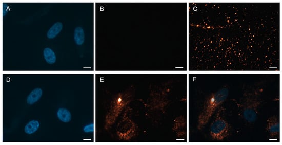 PKH26 staining of EVs and incorporation into cultured tubular epithelial cells (TECs). Fluorescence microscopy showed that TECs (nuclei stained with 4′,6-diamidin-2-phenylindol (DAPI)) uptake PKH26-labeled EVs (red). (A,B) Negative control. TECs incubated with a processed PKH26 solution without EVs ((A) nuclei staining, (B) red fluorescence channel). (C) PKH26-labeled EVs on an adhesion slide. (D–F) TECs incubated with PKH26-stained EVs clearly showing incorporation of labeled EVs into the cytosol of TECs ((D) nuclei staining, (E) red fluorescence channel, (F) overlay of (D) and (E)). Scale bar = 10 µm.