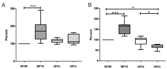 Effect of nEVs and hEVs on cultured TECs. (A) Cell viability after treatment with EVs. TECs were cultured with serum-free medium (M199), standard cell culture medium containing 10% fetal bovine serum (FBS) (MF10), or M199 containing nEVs or hEVs (3 × 108 EVs/well, correlating to an estimated 80,000 EV-releasing ASCs) for 48 h. The 2,3-bis-(2-methoxy-4-nitro-5-sulfophenyl)-2H-tetrazolium-5-carboxanilide (XTT) assay was performed, and optical density was measured in a microplate reader at 492 vs. 650 nm (arbitrary units). Results were calculated as percent versus serum-free M199 as a control (=100%) (mean ± SD, n = 12–16). (B) Measurement of oxidative stress using 2′,7′-dichlorofluorescein diacetate (DCF-DA). TECs were cultured with serum-free medium (M199), standard cell culture medium containing 10% FBS (MF10), or M199 containing nEVs or hEVs (3 × 108 EVs/well, correlating to an estimated 80,000 EV-releasing ASCs) for 48 h. Then, DCF-DA was added for 30 min at 37 °C. Fluorescence of intracellular DCF was measured and normalized to serum-free M199 (=100%; mean ± SD, n = 7–8). *** p < 0.001, * p < 0.05.