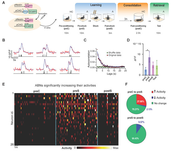 We reanalyzed the Ca2+ imaging data obtained in a previous report [16]. Briefly, we reanalyzed the activity of ~4-week-old ABNs in pNestinCreERT2/pCAG-LSL-GCaMP3 mice throughout the course of a contextual fear conditioning paradigm [16] at the population level. Recordings were performed over three major consecutive periods: learning, consolidation, and retrieval (Figure 1A). Immediately after a recording session in a familiar environment (preconditioning in the home cage, preC; 10 min), the learning period included recording sessions in a conditioning context before foot shock (preshock in context A, preS; 10 min), and the same context after foot shock (postshock in context A, postS; 5 min). In the consolidation period, mice stayed in their home cage for a total of 5.5 h, and recording was performed in the final 2.5 h. During this period, memory consolidation depends on the sparse activity of ABNs during REM sleep [16]. In the postconsolidation period, mice were re-exposed to context A (test; 10 min), during which they exhibited context-specific freezing behavior [16].