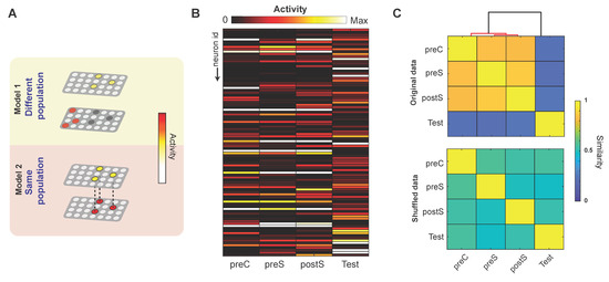 These observations of individual ABN activity, however, do not clarify whether a similar or different population of ABNs is recruited in different periods. For instance, a difference in activity could reflect the recruitment of a new population that is active in a specific period (Figure 2A, model 1) or a change in the activity of the same population (Figure 2A, model 2). To address this issue, we arranged the mean activities of individual ABNs into column vectors across different periods (Figure 2B, hereafter referred to as activity vectors). If a similar population of ABNs is recruited in two different periods, its activity will be correlated. We analyzed this possibility by creating a similarity matrix (i.e., cosine similarity) considering all possible comparisons between activity vectors (Figure 2C). Subsequent hierarchical clustering of this matrix revealed that a similar population of ABNs is active across the preC, preS, and postS periods, suggesting that neither novel context exposure nor shock experience recruits a different ABN population. Surprisingly, a different ABN population was predominantly active during the test period, suggesting that active ABN populations do not overlap between learning and retrieval.