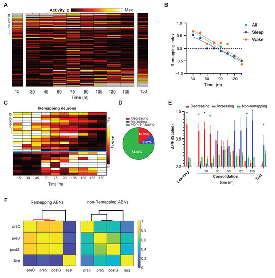 Activity remapping may occur in all or a specific population of ABNs. To discern between these two possibilities, we traced ABNs with activities significantly correlated with time during the memory consolidation period. This revealed two subgroups of neurons, one gradually decreasing their activities, and another one increasing their activities (Figure 3C,D). The ABNs decreasing their activities were predominately active during the preS/postS periods; in contrast, the ABNs increasing their activities were predominantly active during the test period (Figure 3E). Accordingly, significant clusters in the similarity matrix were only detected for the ABNs that showed significant changes in activity during consolidation and not among those that showed no correlation (Figure 3F). Previously, we reported that the ABNs that are active during the postS period are more likely to be reactivated during REM sleep, and the ABN activity in REM sleep is necessary for memory consolidation [16]. This population of ABNs that is reactivated during REM sleep overlaps with the population of ABNs decreasing their activities during the consolidation period (Figure S1C). This suggests that reactivation during REM and activity remapping may be linked phenomena, although causality is yet to be demonstrated.