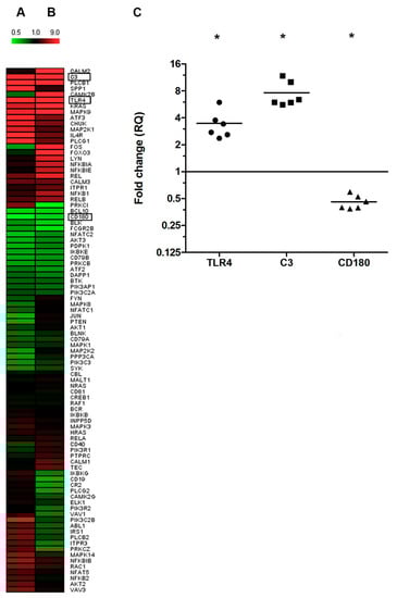 Gene expression analysis of phosphatidylinositol-3 kinase (PI3K) pathway related molecules in B cells. (A) Heatmap representing the mRNA expression of 92 molecules associated with PI3K pathway in B cells of early diffuse cutaneous systemic sclerosis (dcSSc) patients untreated (n = 5) and (B) under immunosuppressive therapy (mycophenolate mofetil, azathioprine or methotrexate, n = 3). Gene expression was normalized to healthy controls (HCs) (n = 5) and value 1 represents the expression of control samples. Colors represent the level of gene expression where the highly upregulated is bright red and the highly suppressed is bright green. (C) Individual qPCR validation of complement component 3 (C3), Toll-like receptor 4 (TLR4) and CD180 gene expression in B cells of dcSSc patients (n = 6) compared to HCs (n = 5). Gene expression was normalized to HC, and the horizontal line (value 1) represents the expression of control samples. Changes in gene expression are shown as RQ values. Data are presented as means ± SEM. * p < 0.05.