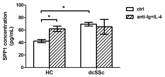 The combined action of the IL-4R mediated alternate and the classical BCR signaling pathways results in the overexpression of SPP1 [13] and the plasma SPP1 level is elevated in SSc [14]. Moreover, the level of IL-4 is elevated in serum and skin samples of SSc patients [15,16]. Consequently, we analyzed the effect of IL-4R and BCR co-engagement on the production of SPP1 and found that the concentration of SPP1 was significantly higher in the supernatant of unstimulated B cells in dcSSc than in HC. BCR and IL-4R co-stimulation could not further increase the secretion of SPP1 by dcSSc B cells, and the level of SPP1 in the supernatant of co-treated HC B cells only reached the basal SSP1 production of dcSSc B cells (Figure 2).