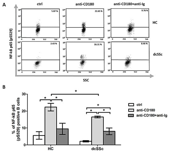 Induction of phosphorylation of NF-κB by CD180 ligation and BCR and CD180 co-engagement. Representative dot plots (A) and changes (B) of the phosphorylation of NF-κB p65 (pS529) molecule in purified B cells of dcSSc patients (n = 5) and in HCs (n = 4) after stimulation with anti-CD180 or anti-CD180 + anti-Ig or left unstimulated (ctrl) for 30 min detected by flow cytometry. Data are presented as means ± SEM. * p < 0.05.
