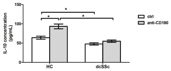 Since the function of regulatory B cells in SSc is impaired [21], and we previously found that the CD180 expression of these cells is downregulated by anti-CD180 treatment [12], we investigated whether stimulation of B cells via CD180 has different effect on IL-10 production in dcSSc and HC. The concentration of IL-10 in the supernatant of both unstimulated and anti-CD180 stimulated B cells were significantly lower in SSc than in HC. Moreover, ligation of CD180 significantly increased the IL-10 production of B cells only in HC (Figure 4).