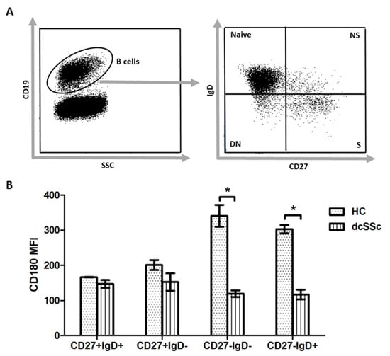 Expression of CD180 in B cell subsets. (A) Gating strategy of CD19+ B cells stained with CD27 and IgD to define the following four subsets: CD27+IgD+ non-switched memory (NS) B cells, CD27+IgD− switched memory (S) B cells, CD27−IgD− double negative (DN) B cells and CD27−IgD+ naive B cells. (B) The mean fluorescence intensity (MFI) of CD180 in NS, S, DN and naive B cells in dcSSc (n = 4) and HC (n = 3), as measured by flow cytometry. Data are presented as means ± SEM. * p < 0.05.